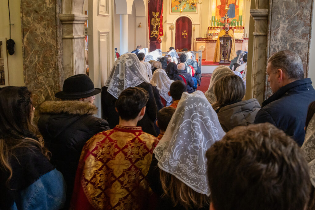 Tijdens de liturgie delen de gelovigen op een bepaald moment de heilige kus met elkaar. Ook hierin speelt muziek een rol. Op dat moment wordt de muziek sneller en dynamischer, bijna chaotisch, maar altijd in harmonie met wat er tijdens de dienst gebeurt. De muziek begeleidt ons precies in wat we moeten doen, alsof het klokken zijn die luiden. Alles wat we doen en zingen is volledig met elkaar in harmonie.