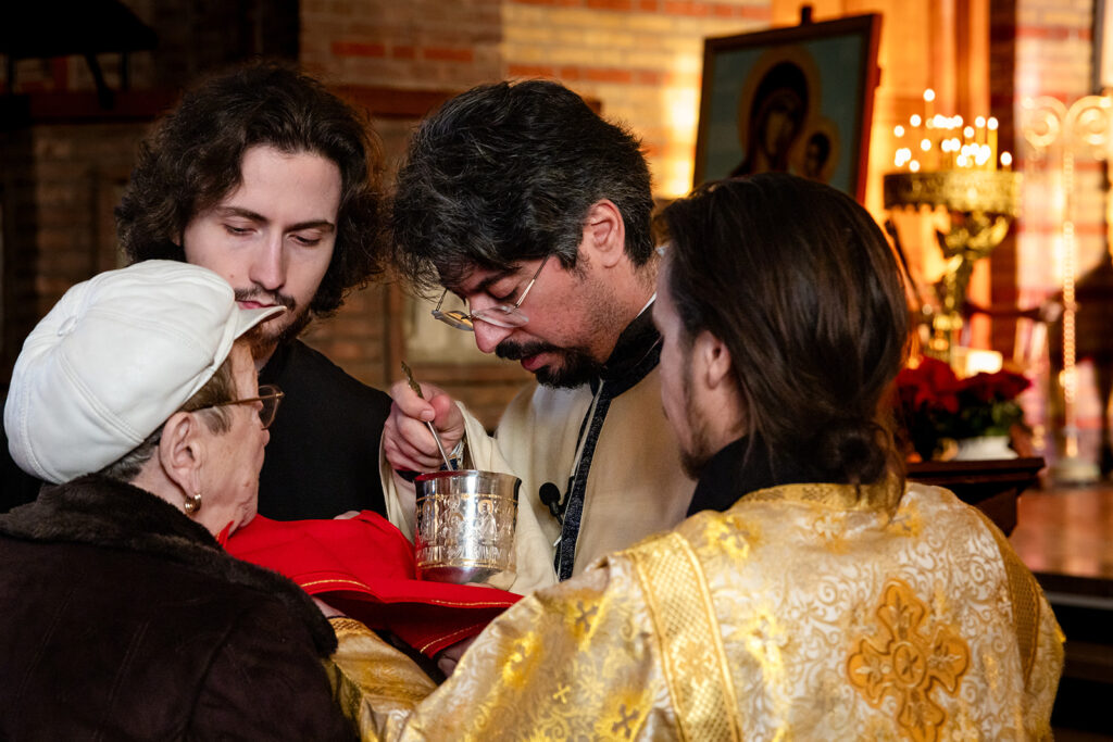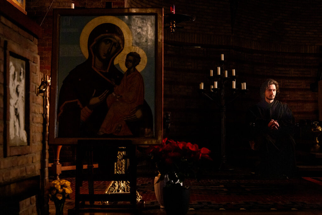 Om half negen op een kille zondagochtend staan er vijftien mannen verspreid door de Hemelvaartkerk. Ze variëren in leeftijd van begin twintig tot middelbaar. Ze zijn gekleed alsof ze zo naar hun werk gaan. Ze komen voor de metten, de dienst van de ochtend en lofprijzing op de cyclus van de dag. De Goddelijke Liturgie (het sacrament van de eucharistieviering) begint om tien uur. Tijdens de metten worden liturgische teksten voorgedragen door een misdienaar. De priester van dienst en diens diakens kussen de iconen die voor het altaar staan, ze vullen de wierookvaten, steken kaarsen aan en maken alles gereed voor de dienst.