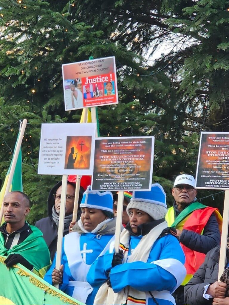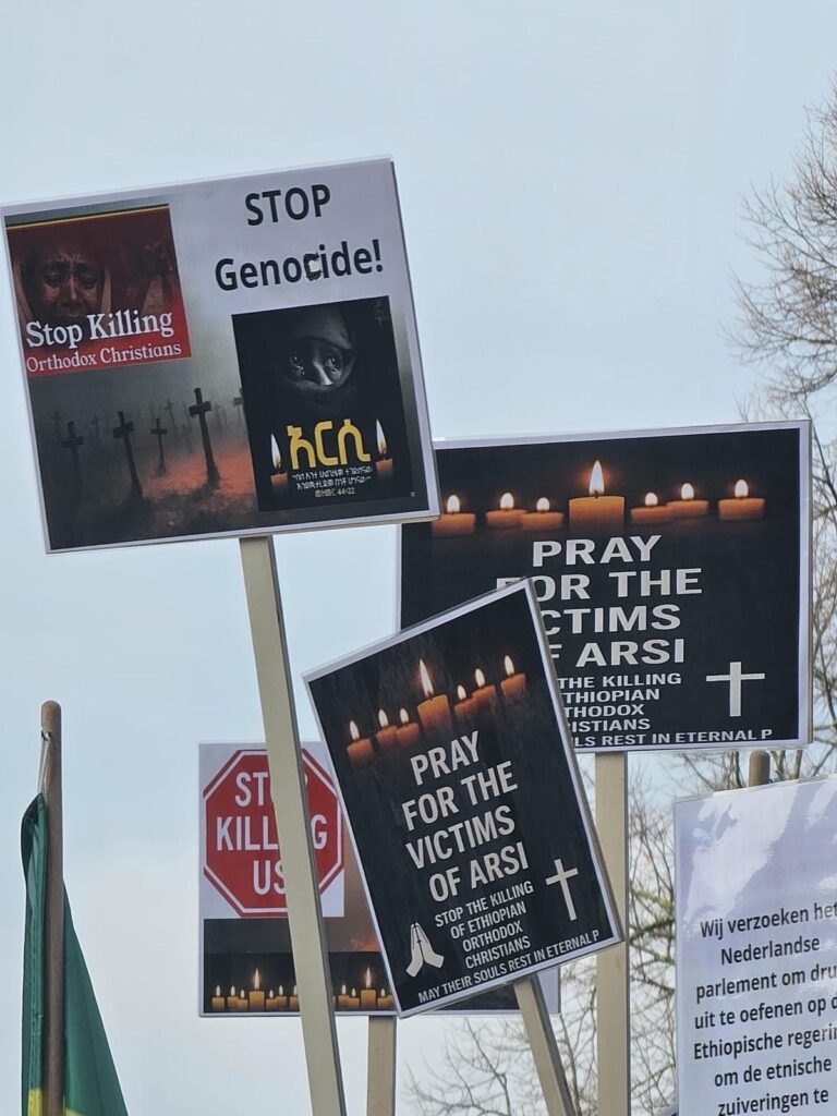 Zo luidden enkele slogans op de borden van de demonstranten. Aanleiding voor deze demonstratie in Den Haag is het systematische en brute geweld vanaf begin oktober in de Arsi zone ten zuiden van de hoofdstad Addis Abeba, waarbij tot nu toe meer dan dertig Ethiopisch-orthodoxe christenen werden vermoord en velen werden mishandeld en gewond raakten.
