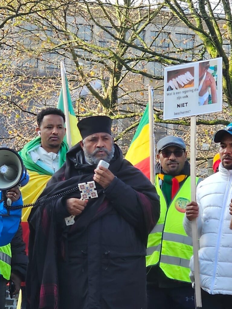 Bij de Laan van Reagan en Gorbatsjov in Den Haag hebben zich zo’n vijftig mensen verzameld, de meesten van hen zijn gehuld in de kleuren van de Ethiopische vlag. Gedurende enkele uren worden er in het Ge’ez, de liturgische taal van de Ethiopisch-orthodoxe Kerk liederen gezongen en gebeden uitgesproken. De sfeer is irenisch. De borden vertellen de boodschap van de demonstratie.