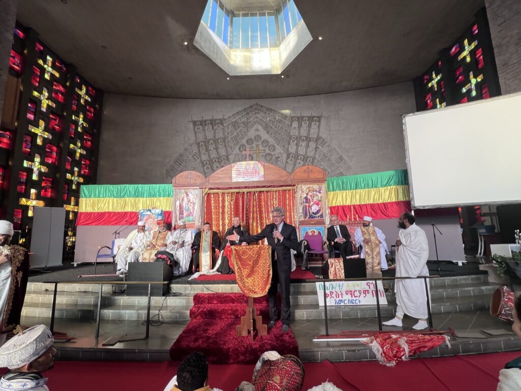 Burgemeester Lucas Bolsius in de Heilig Kruiskerk te midden van de Tewahdo’s. Deze kerk hebben de Ethiopiërs voor één avond, nacht en ochtend van de Baptisten Gemeente gehuurd. De Baptisten Gemeente huurt het van de Katholieke Kerk, waar de Katholieke CDA’r Bolsius zijn communie heeft gehad.