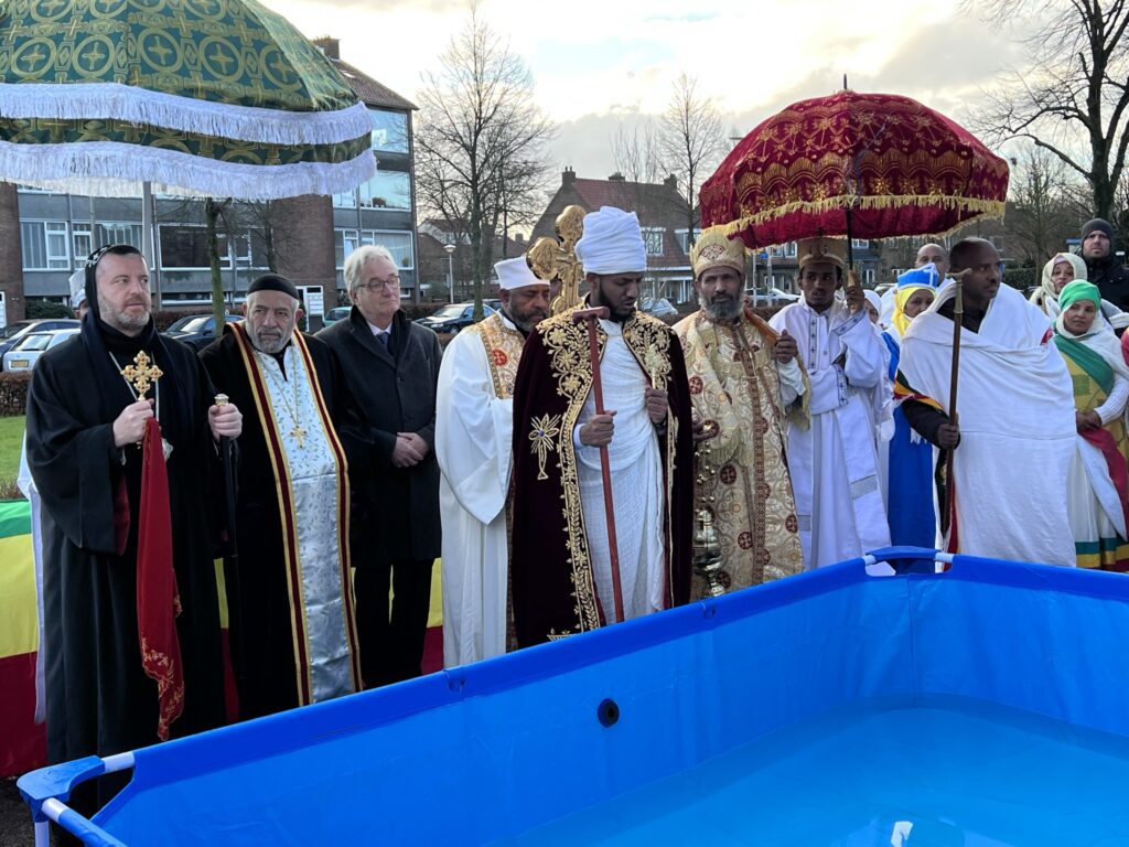 Van links naar rechts: aartsbisschop Mor Polycarpus van de Syrische-Orthodoxe Kerk in Nederland; de Armeense bisschop; voorzitter van de Nederlandse Raad van Kerken, Geert van Dartel. Ethiopische priesters en een Eritrese Tewahdo priester uit Maastricht, Aboy Keshi Muluberhan Hagos. De priester met de lange steunstok, murkus of ‘de stok van Aaron’ genoemd, is de eerdergenoemde jonge priester Qesis Abraham. Zij staan voor een badkuip die de rivier de Jordaan moet voorstellen. Na een lange dienst worden de gelovigen met het gezegende water besprenkeld.